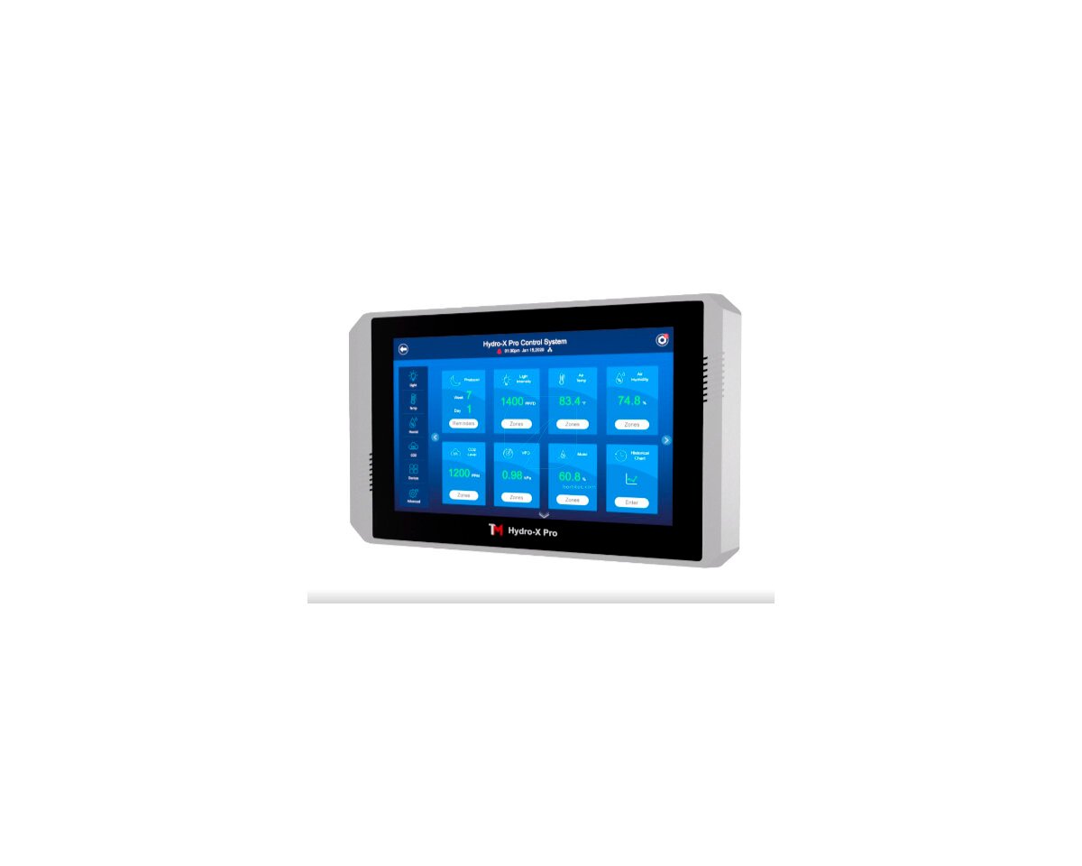 El Hydro-X Pro es un sistema de control ambiental 4 en 1 con el que puedes gestionar a través de sensores temperatura, humedad, fotocélulas y niveles de CO2. El equipo incorpora una pantalla táctil de 10 pulgadas y cuenta con software basado en web.