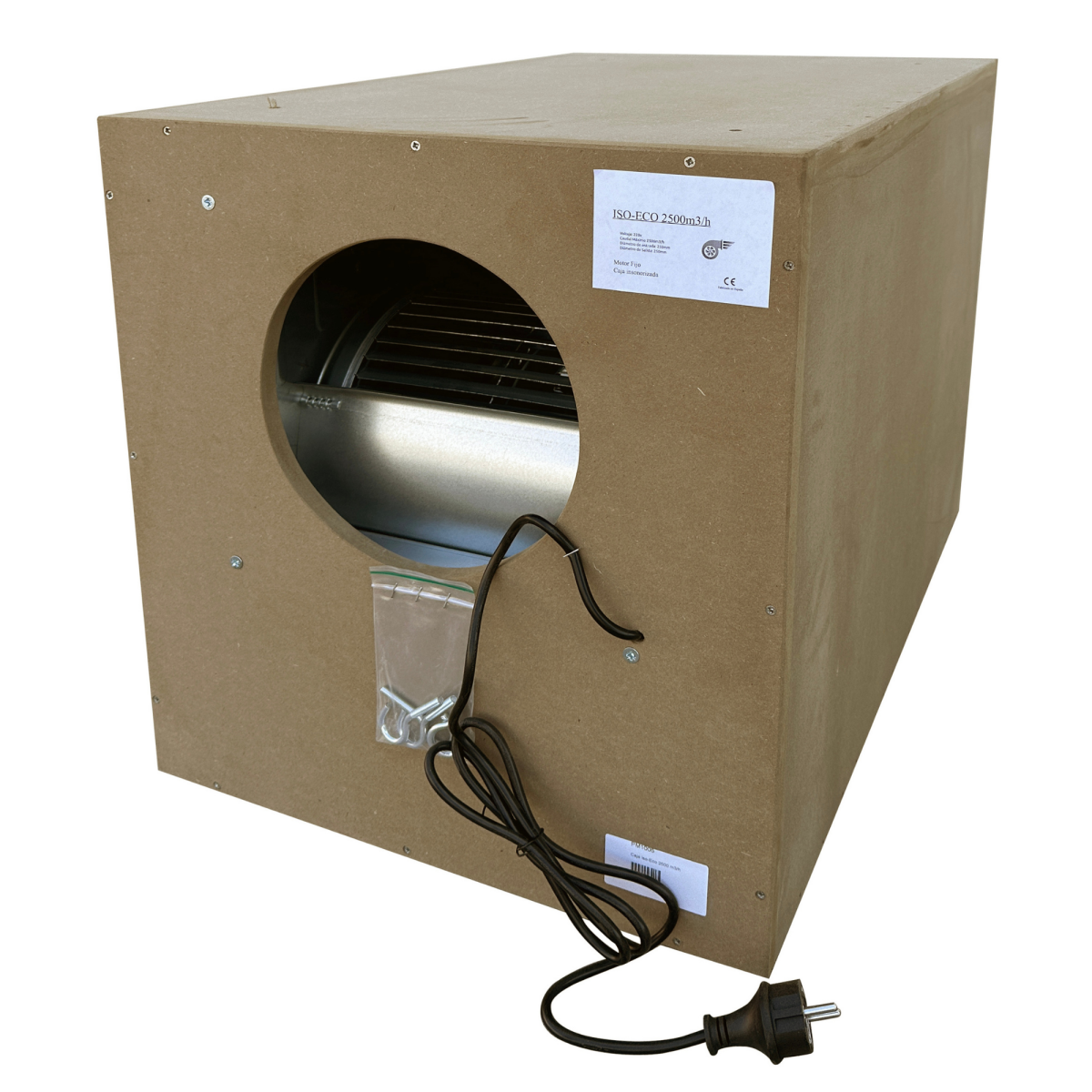 MDF de grosor 16mm. De este modo conseguimos aislar e insonorizar mucho más el ruido de la turbina. El sistema de succión de la turbina produce un gran caudal de aire, con caudales que van desde 1000 m³/h hasta 7000 m³/h.