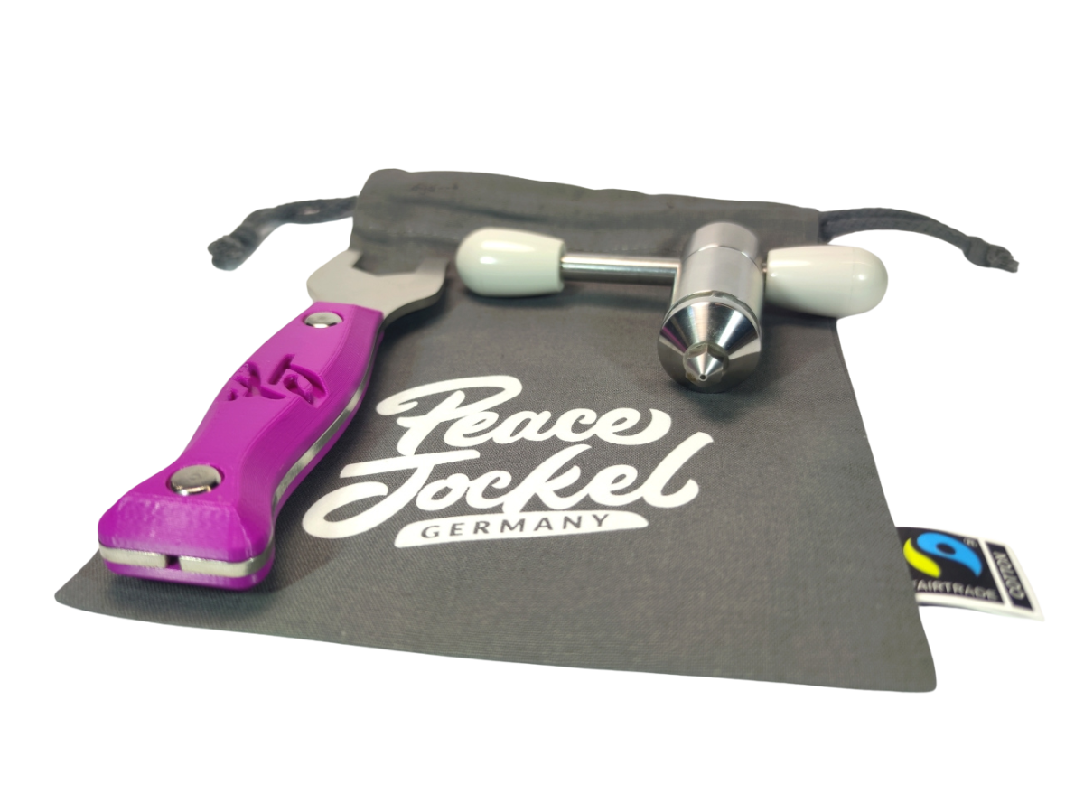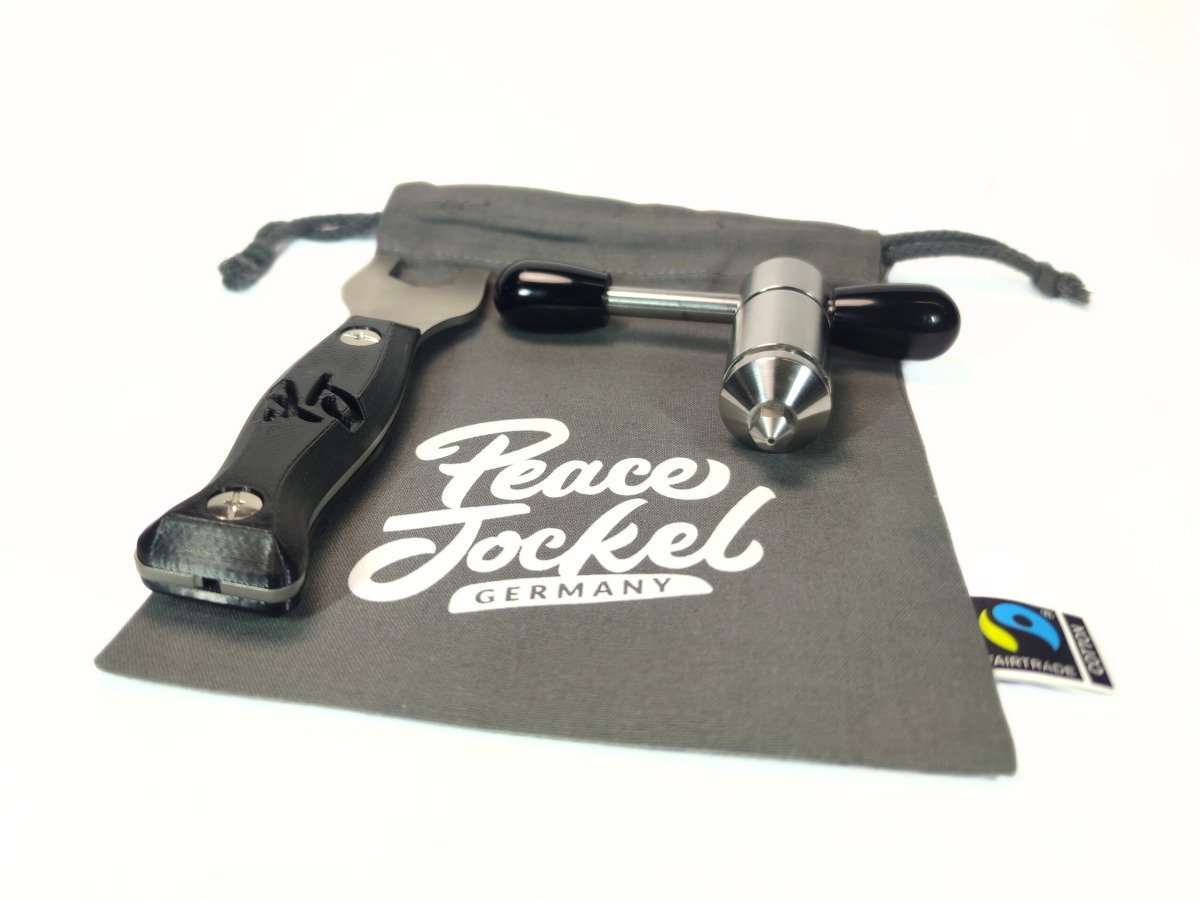 Peace Jockel – El Hash Grinder original. Prepara cualquier tipo de hachís en un cordón perfectamente formado ¡sin ensuciarte las manos nunca más! Nuestro nuevo Peace Jockel Basic está disponible en tres colores diferentes. Todo está hecho de acero inoxidable de alta calidad, todo empaquetado en una práctica bolsa de lona sostenible con espacio suficiente para llevar todos tus productos cómodamente. El Peace Jockel Basic está equipado con nuestra boquilla multiusos de 1.0mm y hecho a mano en Alemania bajo los mismos altos estándares que su hermano mayor, el Peace Jockel