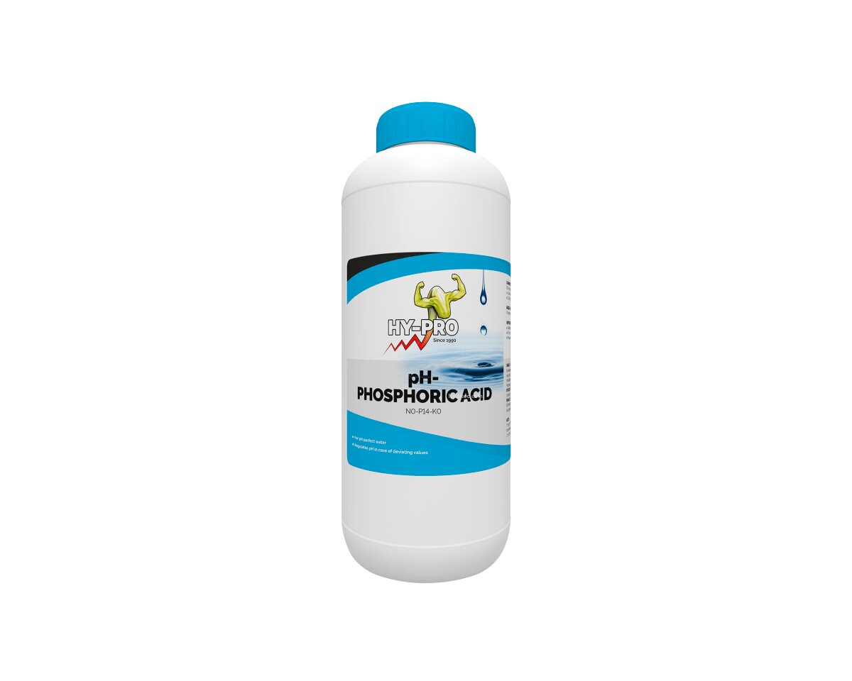 Hy-PRO Phosphoric Acid pH- es un producto que te permite reducir el valor de pH de tu solución de nutrientes. El valor recomendable de pH para que la planta pueda absorber sin problemas los nutrientes que le proporcionamos y, de este modo, tenga un mejor desarrollo de es 5.5 Y 6.