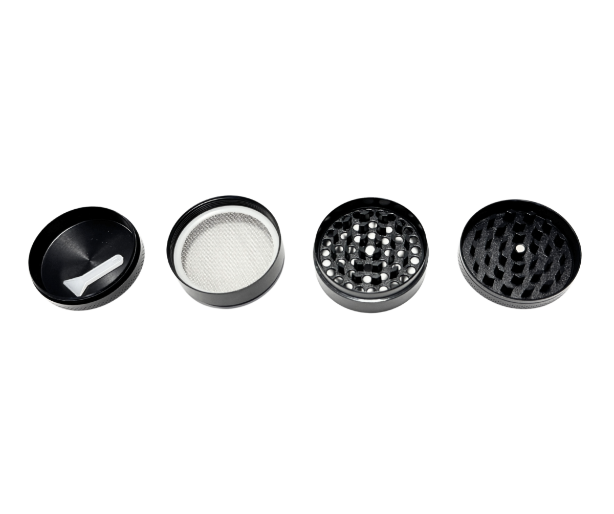 Grinder de aluminio de alta calidad con un diámetro de 55 mm y una altura de 40 mm. Compuesto por 4 partes: zona de molienda, filtro intermedio para separar por tamaño y un segundo filtro para polen fino. Resistente, funcional y fácil de desmontar para su limpieza.