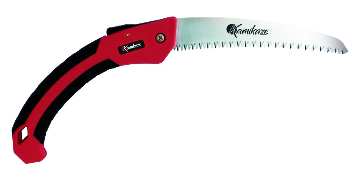 Serrucho plegable de hoja curva de 180 mm. Mango de plástico revestido en goma que hace el trabajo muy cómodo para la mano incluso sin utilización de guantes.