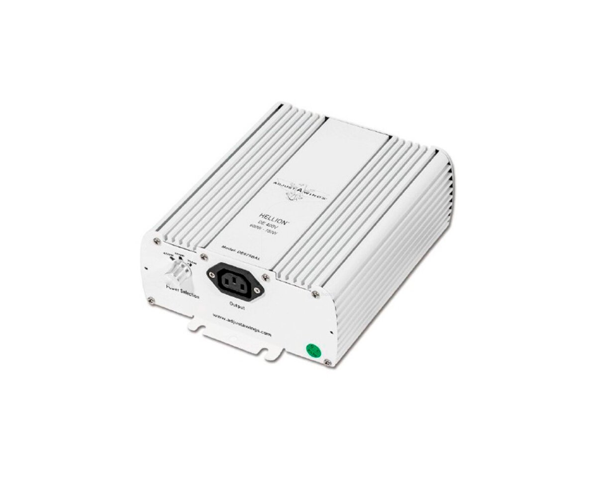 EL Balastro Hellion D.E. De Adjust-A-Wings®, es un balastro pensado para los cultivadores. Éste cuenta con conexiones IEC e incluye soporte para colgar y cable de alimentación homologado.