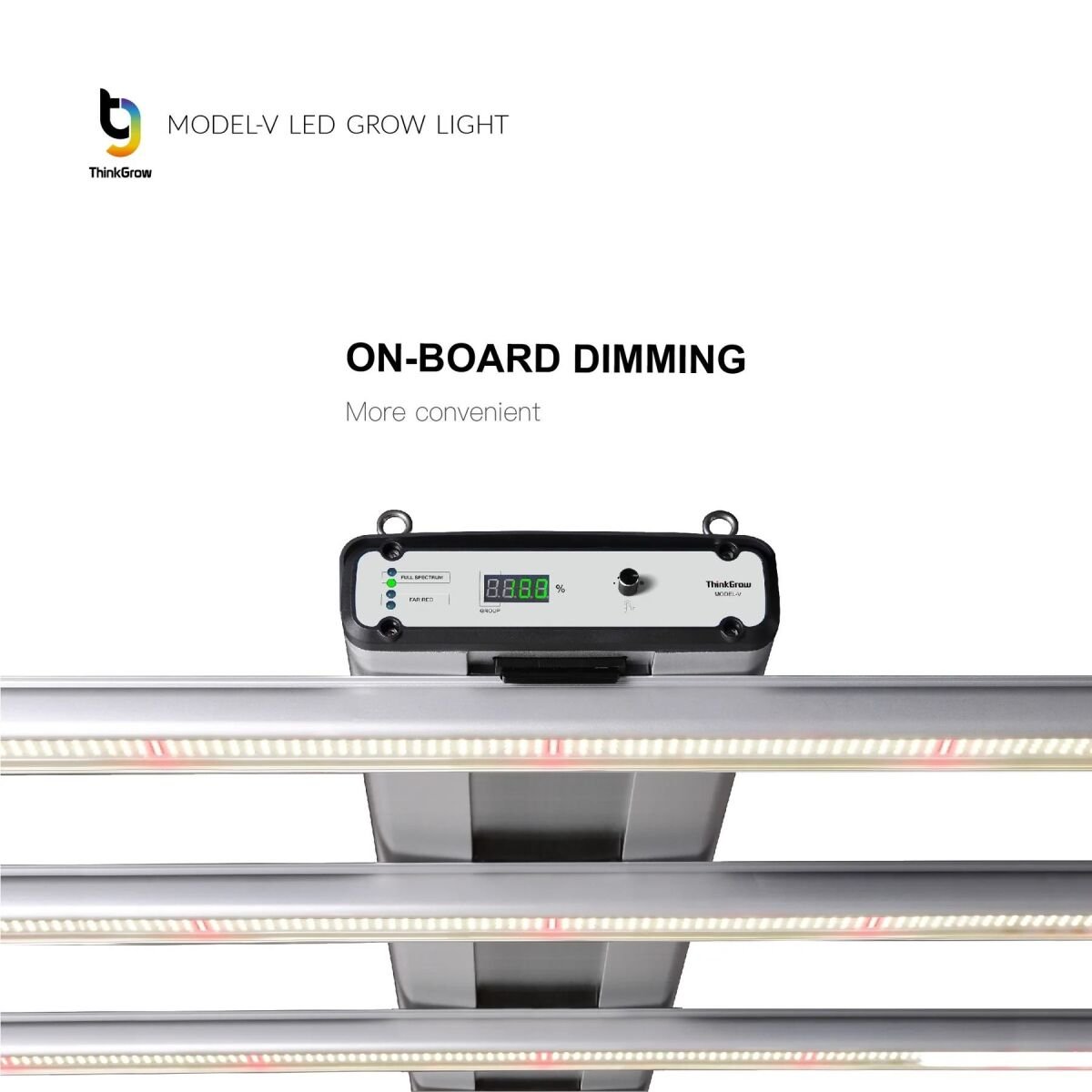 ThinkGrow Model-V 250w, pensado para la fase vegetativa o ciclo completo del cultivador casero que no necesita mucha potencia. Mantiene las ventajas de poder controlar el espectro en dos canales separados (blanco y rojo lejano) usando el adaptador LMA-T. Este adaptador te permitirá controlar hasta 256 luminarias conectadas en línea o con múltiples adaptadores dentro del mismo sistema de control.