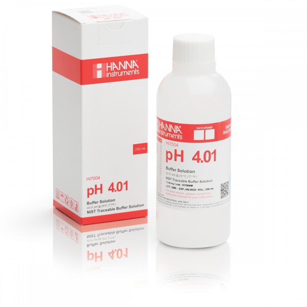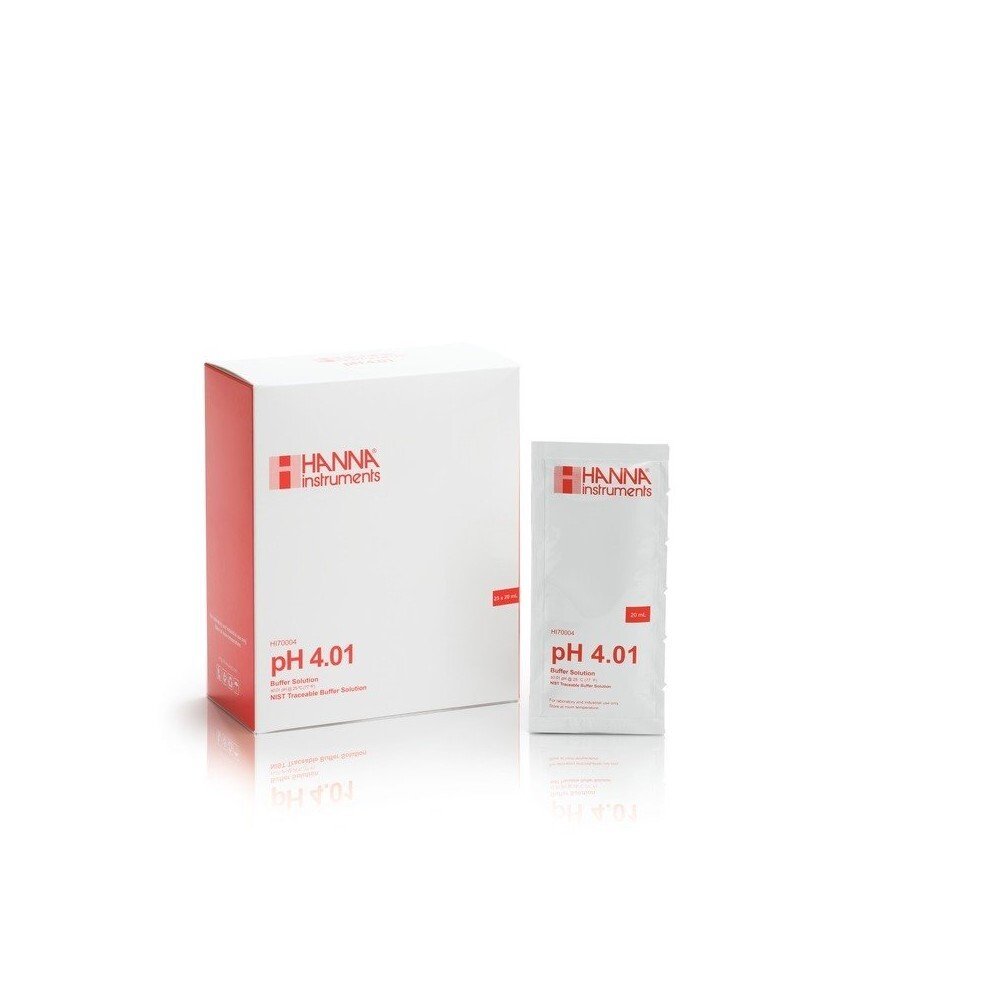 Solución tampón de pH de 4,01. Una de las soluciones tampón más utilizadas, es extremadamente estable y representa el punto intermedio en el rango ácido de la escala de pH, ideal para aquellos que requieren una lectura precisa de ácido, particularmente aquellos donde se espera que el pH sea ácido.