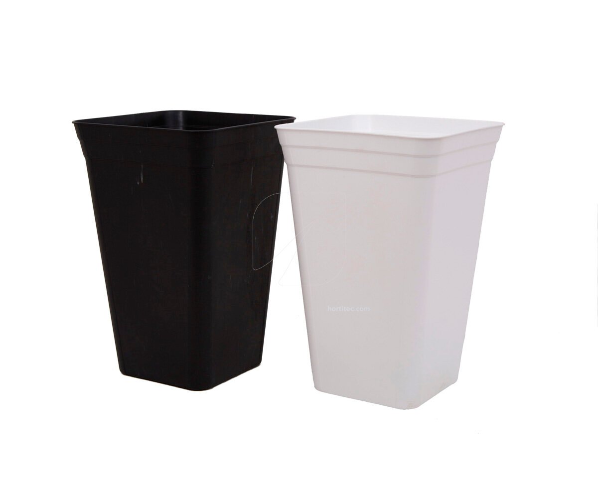 Macetas cuadradas de plástico de gran profundidad para retener mejor la humedad y los nutrientes, además de dejar mucho espacio para un buen desarrollo radicular de la planta.