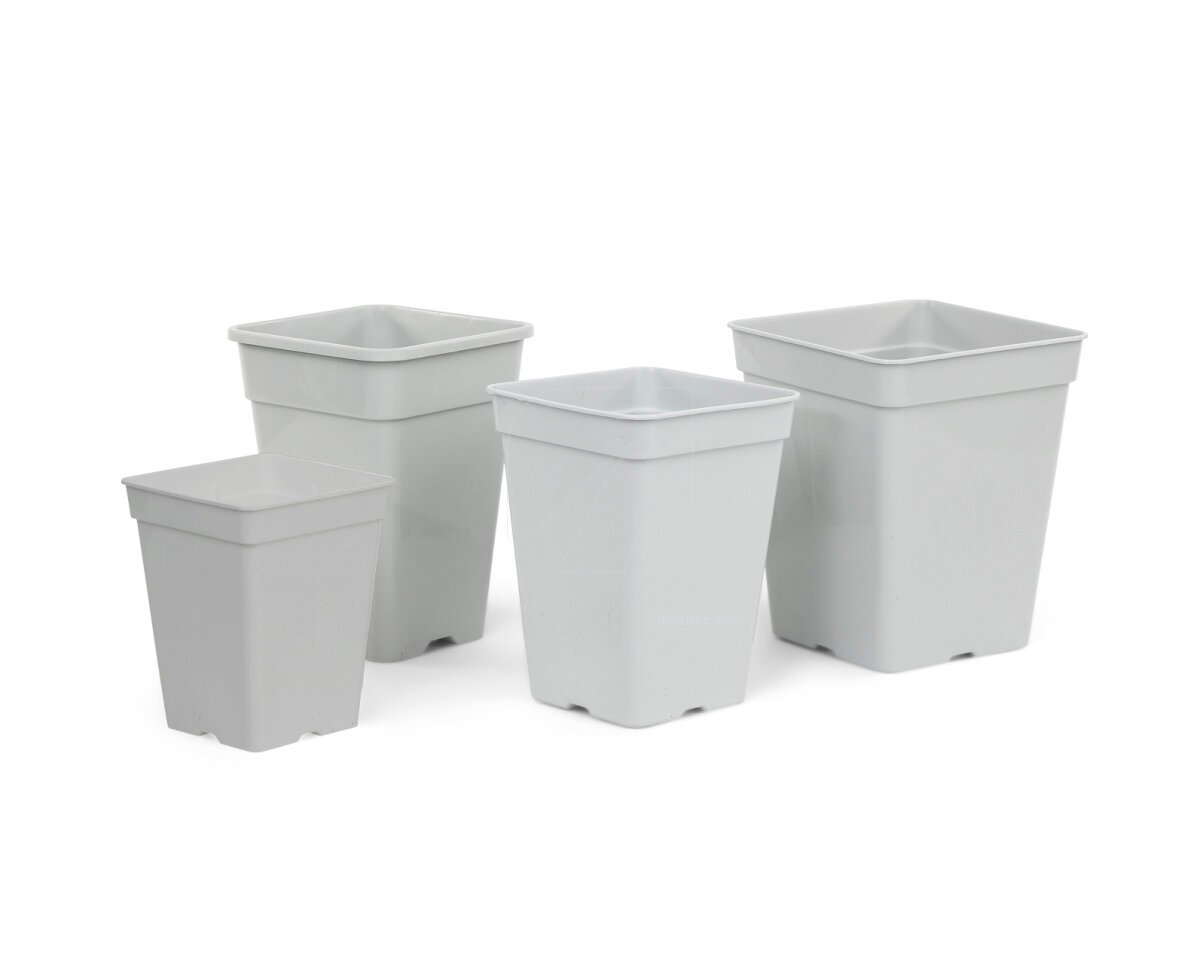 Sólidas macetas cuadradas blancas con el fondo elevado para un drenaje sin problemas y para cultivos de interiores.