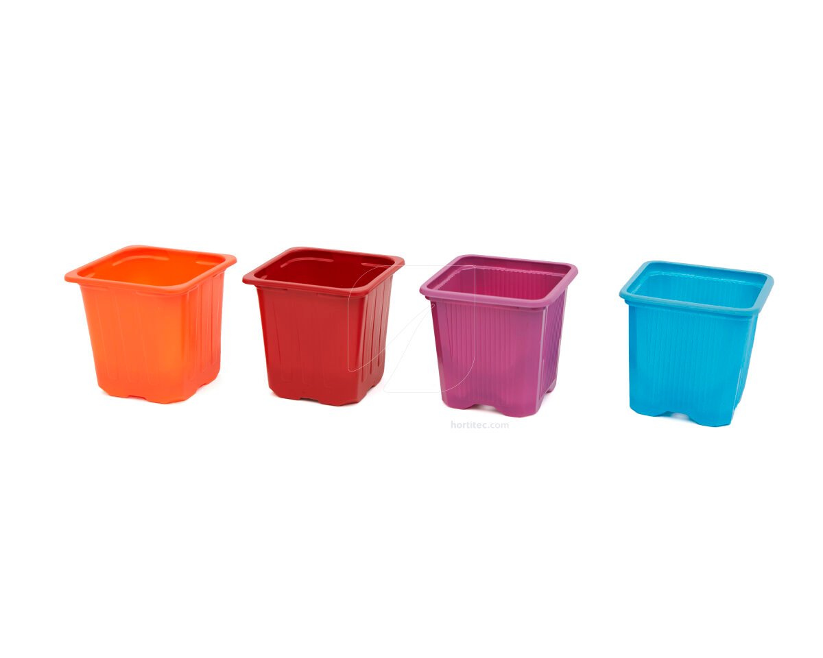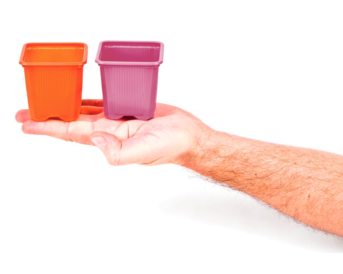 Las macetas cuadradas de colores están disponibles en naranja, azul, amarillo y violeta, aunque éstos pueden variar. Todos ellos con un mismo tamaño: 7 x 7 x 6,5 cm