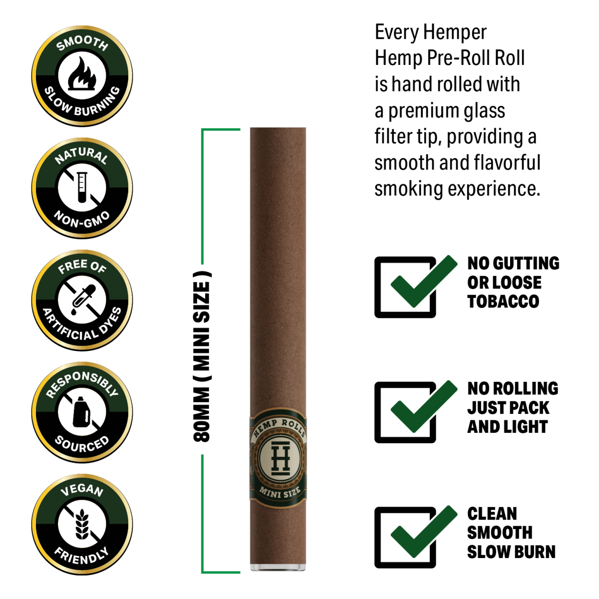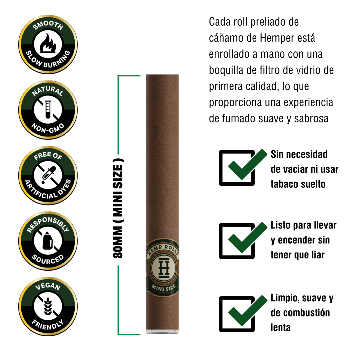 Cada uno de los rollos está cuidadosamente enrollado a mano y equipado con la punta de vidrio reutilizable, lo que garantiza una experiencia más suave, un sabor limpio y una combustión lenta. Los rollos vienen protegidos en un envase tipo “clamshell” que preserva su frescura y evita daños.