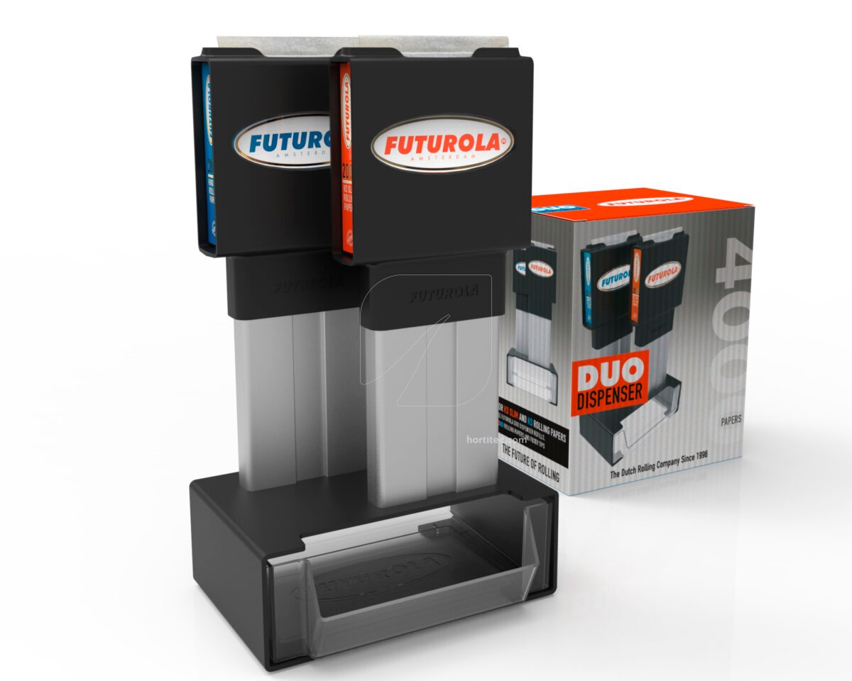 El dispensador Futurola Duo Dispenser, es el accesorio perfecto con espacio para introducir dos cajas de 2000 papeles diferentes. De este modo, puedes tener a tu disposición 4000 papeles para cogerlos cómodamente del dispensador. En la parte inferior hay un hueco para las boquillas, así puedes tener a mano todo lo que necesitas.
