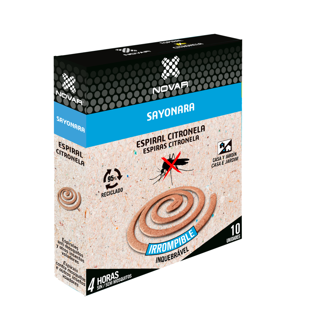 Ideal para ahuyentar mosquitos y otros insectos voladores en espacios exteriores como terrazas, jardines, campings… Sin perjudicar la salud ni el medio ambiente. Fabricado en fibras naturales (irrompible), 100 % de combustión lenta y estable. La Espiral actúa por combustión liberando un agradable olor a citronela, protegiéndole de mosquitos y otros insectos voladores en el exterior.